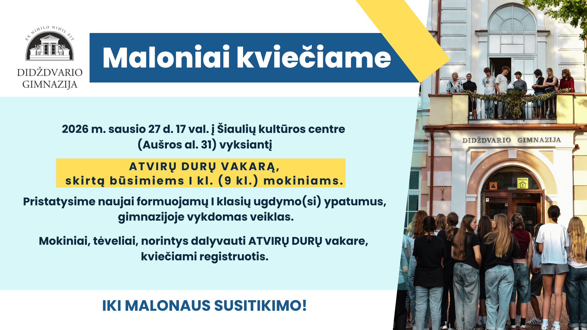 admin2026-01-20T13:03:17+02:00Sausio 16 d. Didždvario gimnazijos mokiniai vyko į Vilnių, į ISM vadybos ir ekonomikos universitetą. Šios išvykos metu gimnazistams buvo sudarytos galimybės išsamiau susipažinti su studijų galimybėmis ir siūlomomis programomis. Mokiniai dalyvavo fokus grupėse, kuriose bendravo su jau studijuojančiais ISM studentais, klausėsi paskaitos apie reklamą, domėjosi studijų ypatumais bei turėjo progą užduoti jiems rūpimus klausimus. Edukacinė išvyka buvo skirta padėti gimnazistams geriau suprasti studijų kryptis ir apsispręsti dėl savo ateities studijų pasirinkimo. Kristina Laurutė, karjeros specialistė